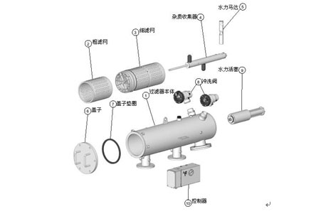 水力驅(qū)動自清洗過濾器由主管組件、端蓋組件、細(xì)濾芯組件、粗濾芯組件、吸污器組件、水力馬達(dá)、水力缸組件、排污閥、管路控制系統(tǒng)等主要零部件組成。水由入水 口進(jìn)入過濾器,首先經(jīng)過粗濾芯組件濾掉圈套顆粒的雜質(zhì),然后到達(dá)細(xì)濾網(wǎng),通過細(xì)濾網(wǎng)濾除細(xì)小顆粒的雜質(zhì)后,清水由出水口排出。
